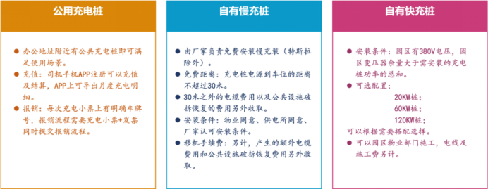 自有充电桩可选安装在企业办公场所的停车位,或驾驶员住所的固定车位,功率有20kW/60kW/120kW三种可选,电池充满时间分别约为4小时、1.5-3小时、1-1.5小时,价格也逐级递升,电缆费及安装费另计。