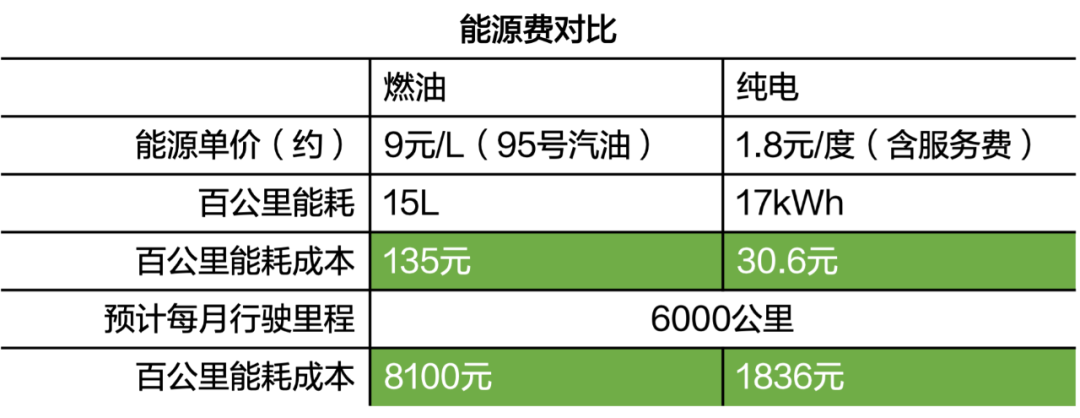油/电费是用车过程中的主要支出。我们以2.0排量的燃油车,与同级别的新能源车对比,计算油/电费的差别: