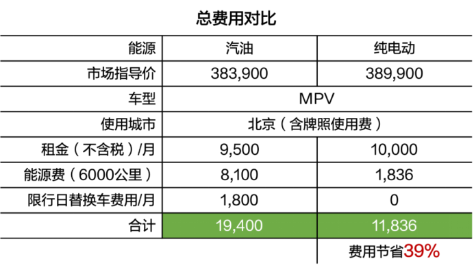 新能源车由于二手车保值率的问题,月租金要略高于同级别的燃油车。但围绕企业用车,租费并不是全部成本。