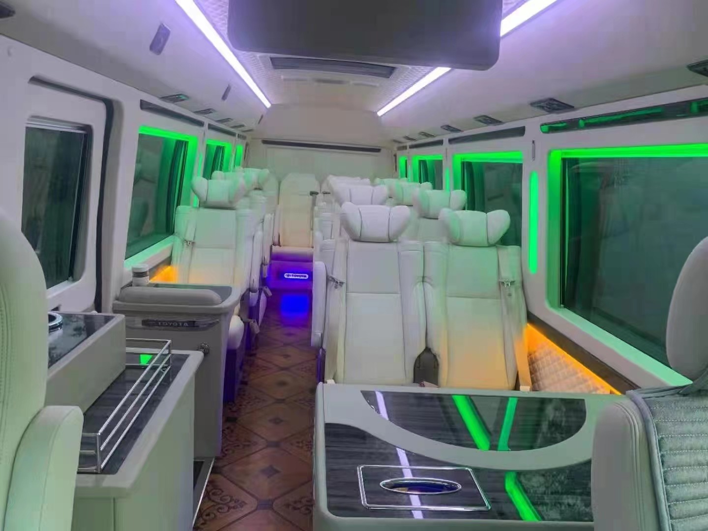 丰田考斯特20座经过专业改装,已达到办公娱乐于一体,配备4.0 V6发动机提供强劲的动力输出。整车主要配置:无线WiFi、19寸电视(可链接手机等设备)、全车航空座椅座椅、220V电源插座,冰箱、热水壶、卡拉OK娱乐系统、高档音响、十组可调氛围灯,随心所欲,是您接待重要领导及客户的不二之选。