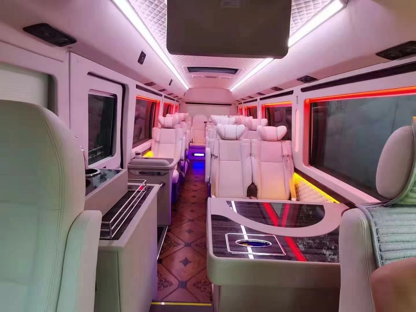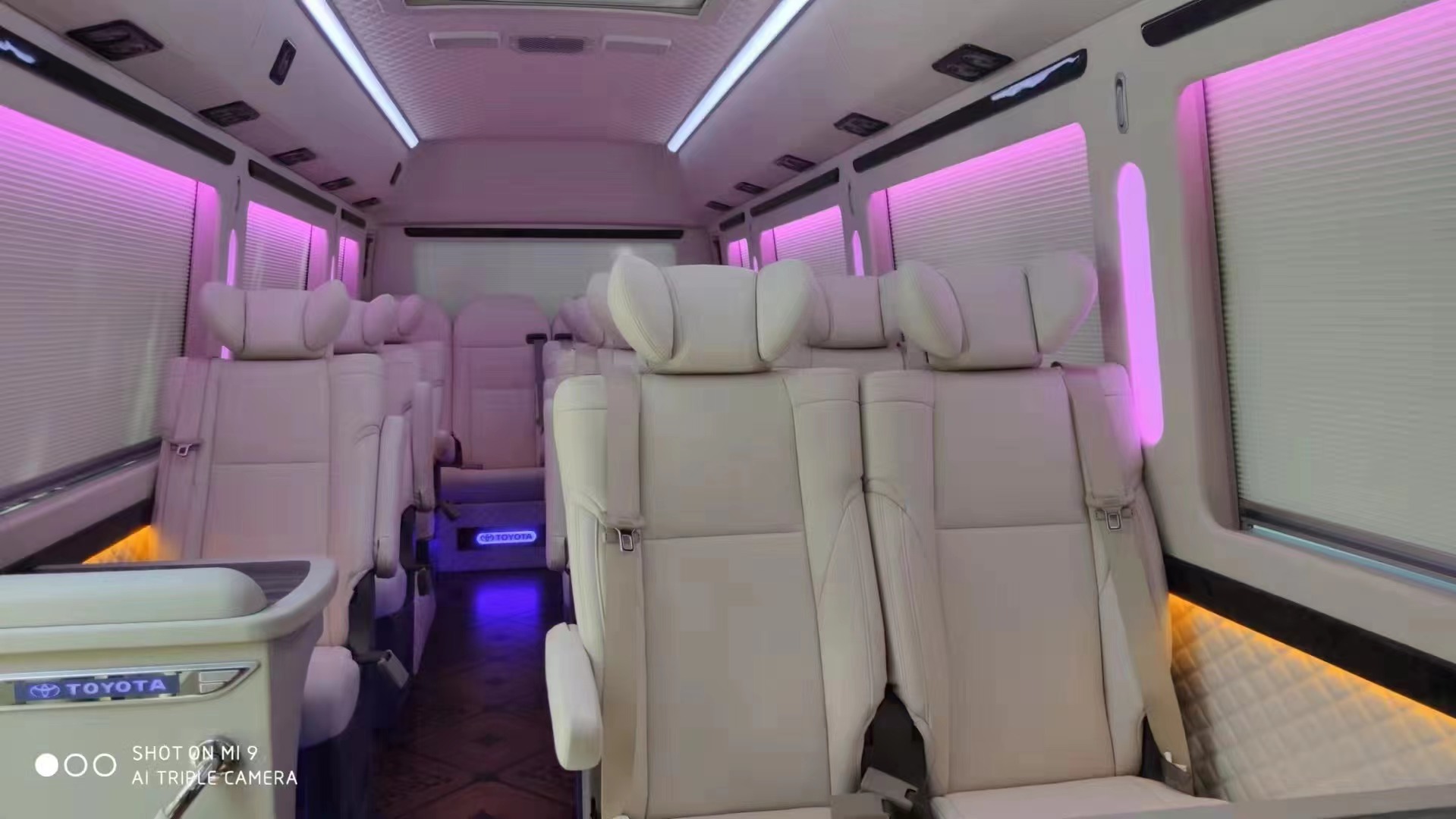 丰田考斯特17座经过专业改装,已达到办公娱乐于一体,配备4.0 V6发动机提供强劲的动力输出。整车主要配置:无线WiFi、19寸电视(可链接手机等设备)、全车航空座椅、空气净化器、司乘私密隔断、电动遮阳帘、220V电源插座,冰箱、热水壶、卡拉OK娱乐系统、高档音响、十组可调氛围灯,随心所欲,是您接待重要领导及客户的不二之选。