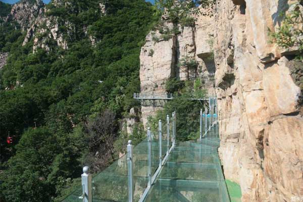 景区中的翠屏峰、莲花峰、四姑娘山、玉屏山、拔地而起,直入云霄,既有北方山峰雄伟壮观之势,亦有南方山川秀丽险峻之韵。徒步或乘坐索道登上主峰莲花峰,向南可观神奇的石海似中华地图:向北千沟万壑尽收眼底,不由的感叹悬崖峭壁之上栈道的惊险:西望雄壮的古长城与烽火台蜿蜒在老虎岭上:东望群山,“会当凌绝顶,一览众山小”的豪迈情怀不由得在心中激荡!