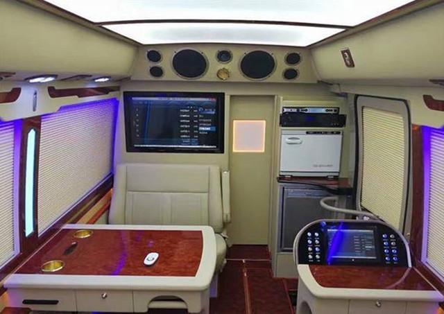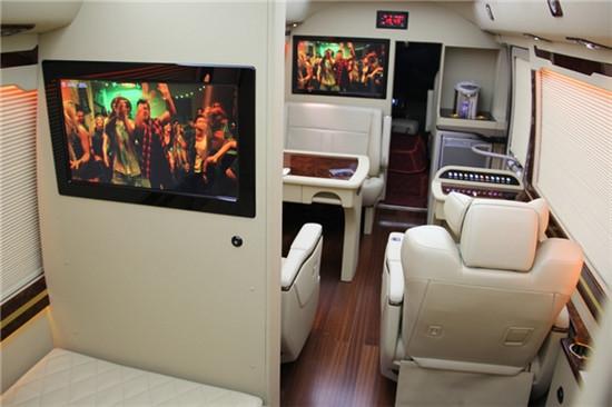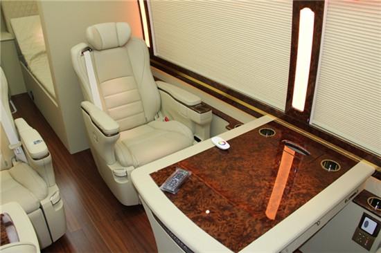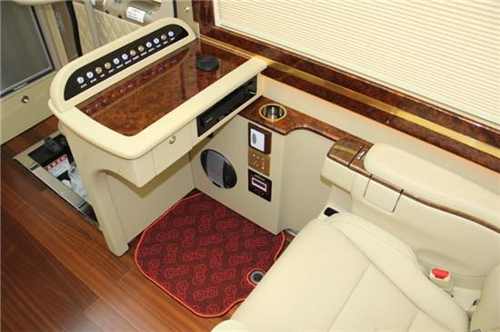 窗帘内侧可以加装LED各种颜色的灯光,台阶上可以镶嵌LED灯光,显示品牌坐标LOGO等。这样的灯光直观的视野效果可以衬托出舒适与品位,这样的空间也很好的给改装提供了便利的条件,也正是品位的象征,和领导们追求的舒适性能。