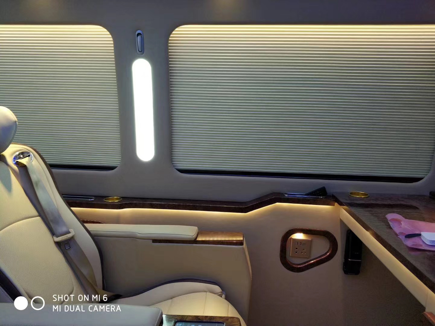 丰田考斯特作为一款高档公商务车,考斯特自然配有与它相称的高级地毯,改装之后的地毯散件有着阻燃,抗静电,防滑,环保等优质性能,为您带来更好的乘坐体验。豪华首长席办公桌桃木纹与真皮结合,桌面带有杯托,220V电源转接盒,对讲机,抽屉,安全扶手,隐藏式电动水壶,小型车载打印机等多种多用配置,丰田考斯特改装商务车在内饰的设计上带给我们更多的贴心和舒适。可折叠秘书桌面板采用桃木纹装饰,集实用与美观于一体,力求最大限度地造福乘驾者。