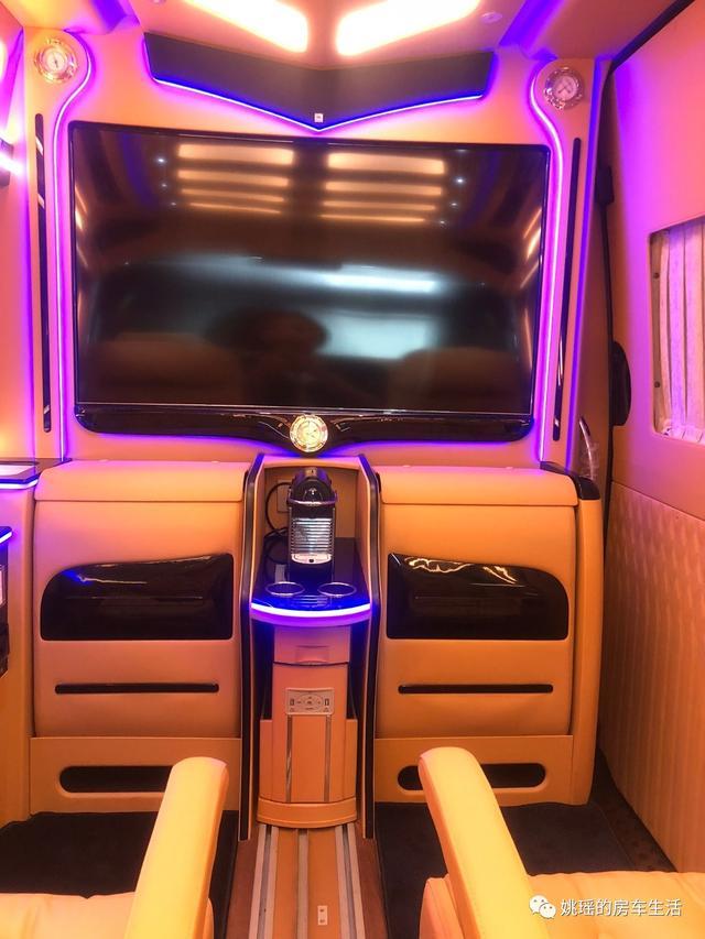 奔驰斯宾特皇宫版后舱采用全隔断设计,隔断上方是一个可升降55寸曲屏高清超薄LED液晶电视,可切换隐私或开放的前后格局!下方是多功能吧台,隐藏着两张非常舒适的秘书座椅,可通过集中控制屏一键操控,非常的便捷,同时充分利用了车内的空间!Sony高清蓝光DVD蓝光影碟机、吧台镶嵌式精美时钟,Bose5.1保真环绕音响、车顶进出气孔壁饰精致纹理,以及实用性胶囊咖啡机以及隐藏小桌板都在这个吧台中可以找到。