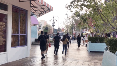 「好莱坞」位于园区入口处,小北重回起点,当夜幕的灯光亮起,简直像来到梦幻世界。17:30分,道路两旁坐满了游客,期待着精彩的花车巡游。