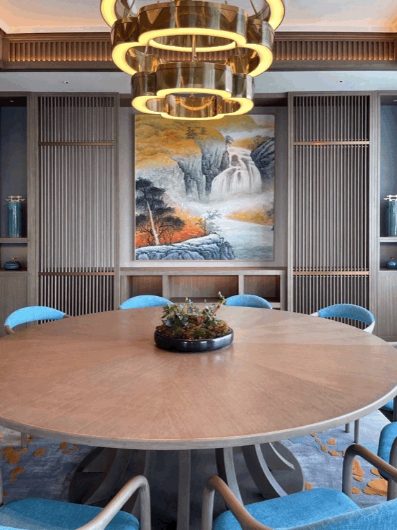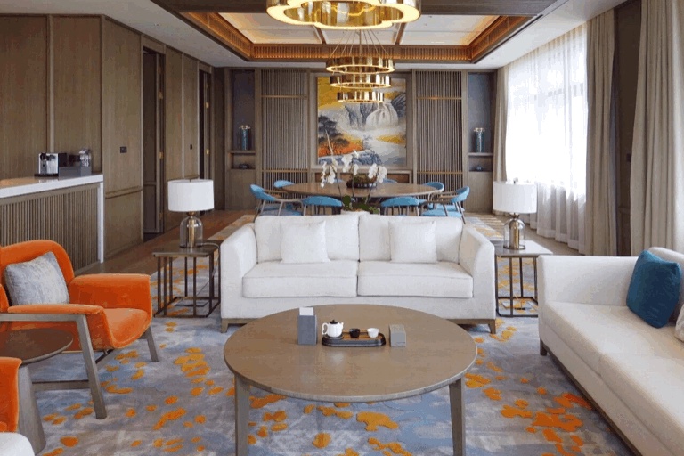 200平的房间在寸土寸金的京城是明明白白的壕!房间延续现代中式风,冷棕调的木饰营造出雅致的意境,爱马仕橙传递出诺金恰到好处的热情,超大会客厅可同时容纳8-10人!