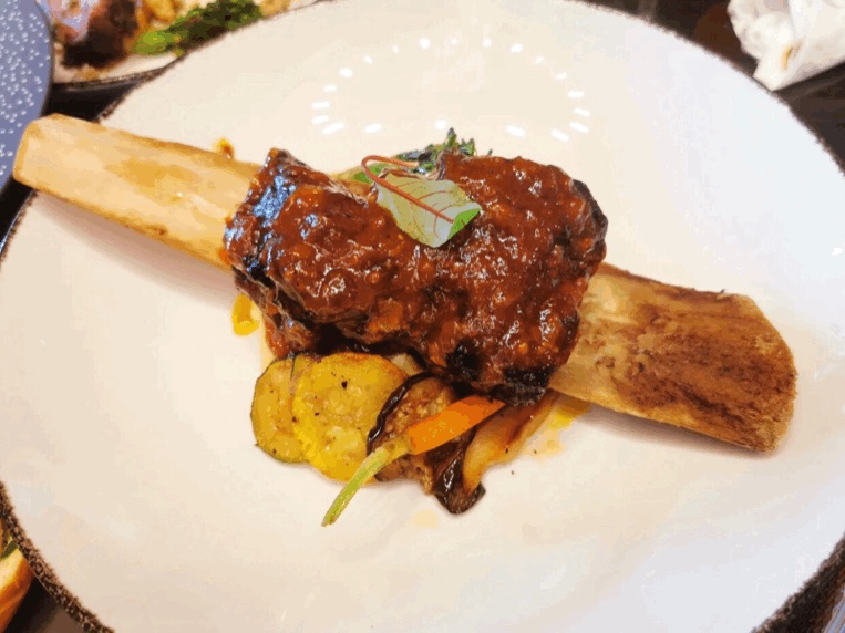 口感清新不油腻~烟熏牛肋排佐上沙茶酱汁,搭配土豆泥、酸黄瓜和一些配菜,吃几口能量值瞬间回升!