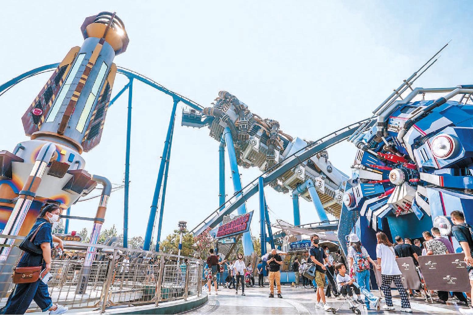 在变形金刚基地景区,紧张刺激的霸天虎过山车吸引不少游客体验。 本报记者 武亦彬摄