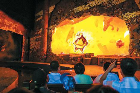 在功夫熊猫盖世之地主题景区,游客体验“灯影传奇”项目。
