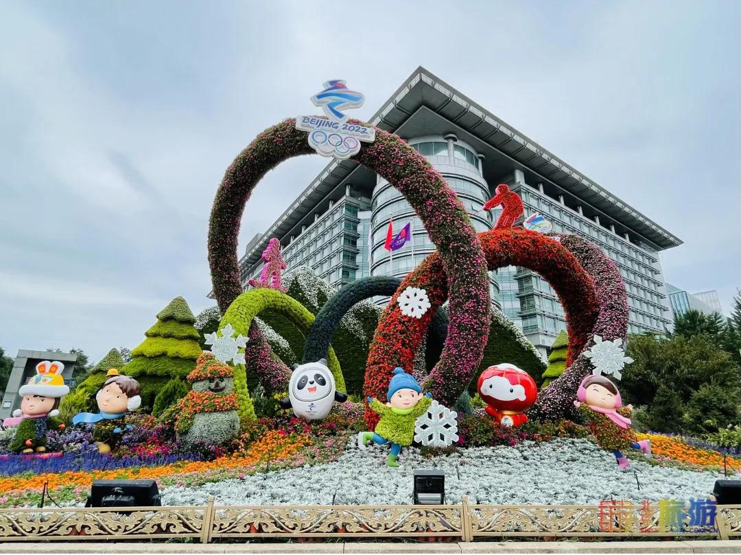 西单西南角“喜迎冬奥”花坛,以喜迎冬奥的冰天雪地为主景。弘扬奥运精神,展示中国魅力。
