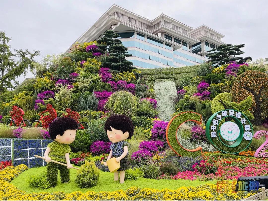 西单东南角“绿色发展”花坛,通过百花齐放春满园的场景,配以白鹤滩水电站、太阳能板、骑行的人、植树的儿童、碳中和计算互动装置等,展示出通过提升林业碳汇,助力实现碳中和同时展望绿色发展的美好明天。