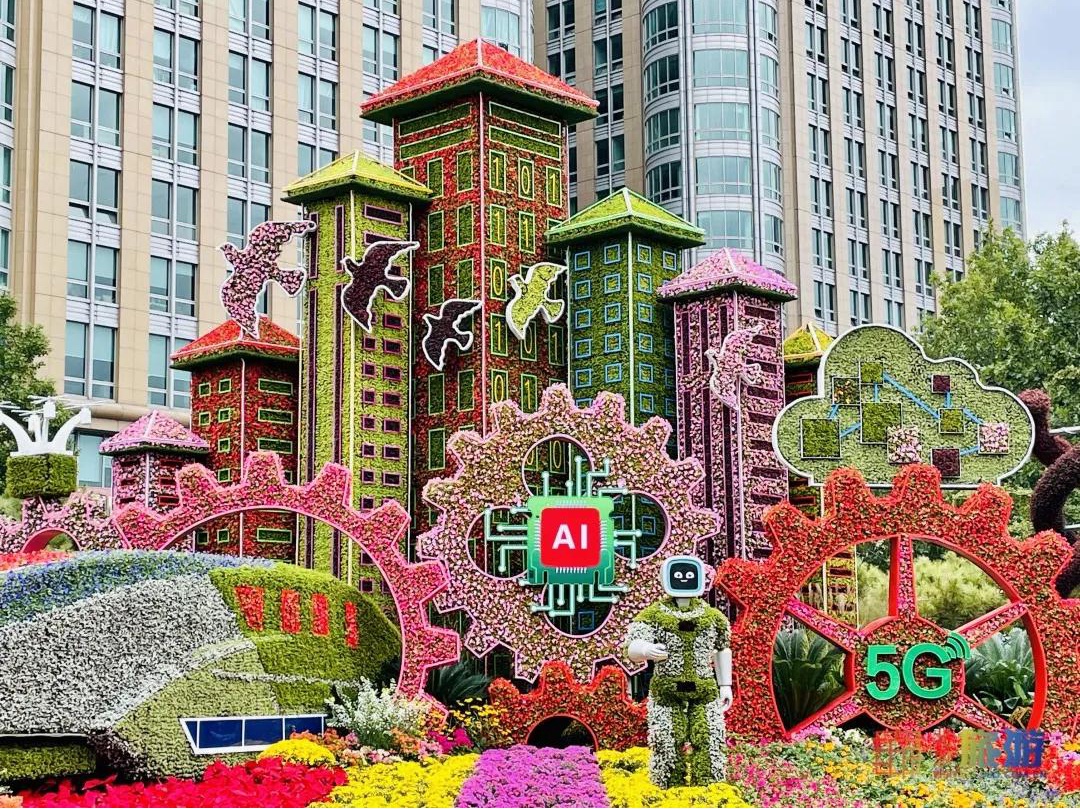 东单东南角“高质量发展”主题花坛,以高速磁悬浮列车、人工智能、5G、芯片、区块链技术等为场景。