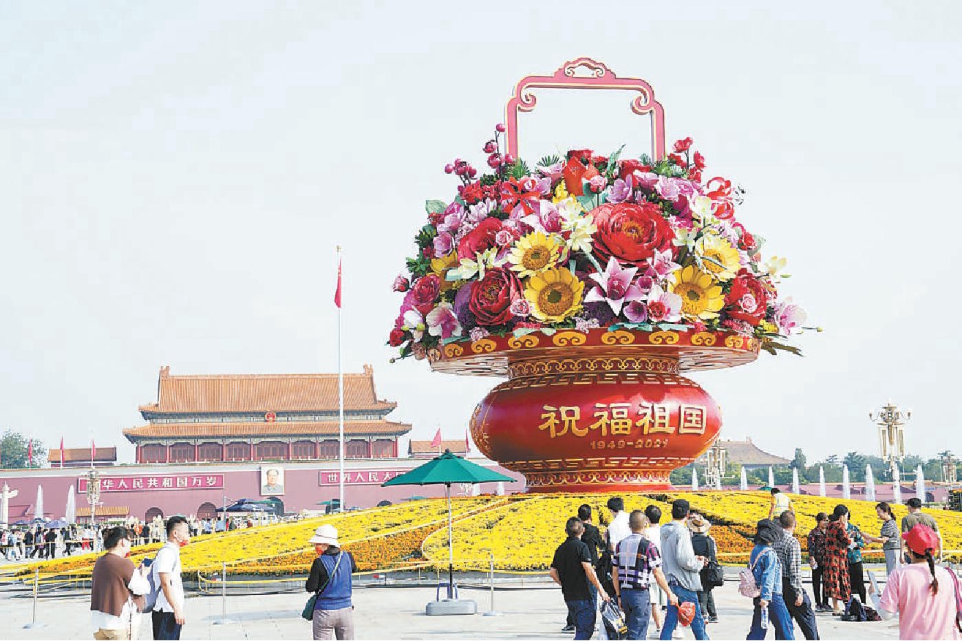 昨天,“祝福祖国”花篮亮相天安门广场,吸引众多市民游客参观打卡。 本报记者 王海欣摄