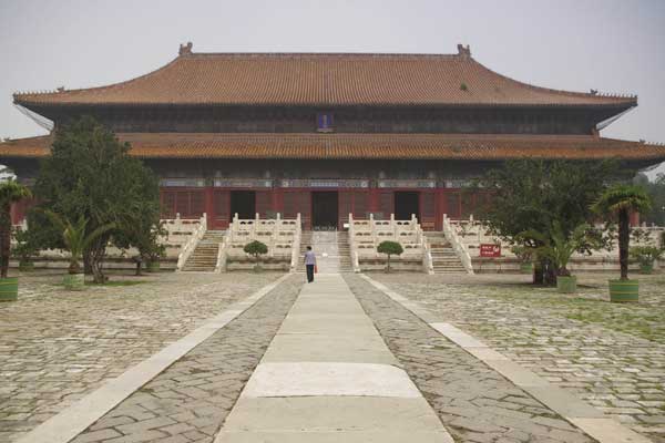 明定陵:陵宫的总体布局亦呈前方后圆之形。其外围是一道将宝城、宝城前方院一包在内的“外罗城”。城内面积约18万平方米。外罗城仅前部正当中轴线位置设宫门一座,即陵寝第一道门。其制,黄瓦、朱扉、设券门三道。