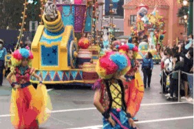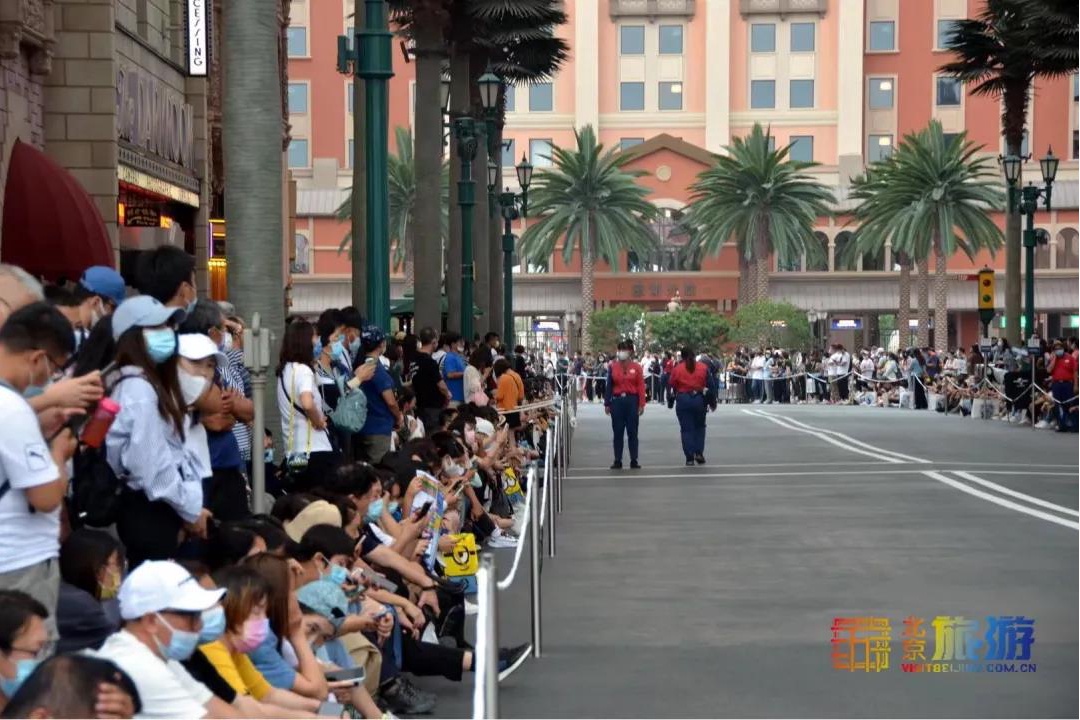 「好莱坞」位于园区入口处,小北重回起点,当夜幕的灯光亮起,简直像来到梦幻世界。17:30分,道路两旁坐满了游客,期待着精彩的花车巡游。