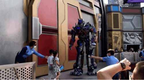从「霸天虎过山车」下来,距离不远处就能听火爆网络的“话痨”威震天说“相声”!但也许下一秒出场的会是温柔的擎天柱,对两位小朋友也是相当友好。