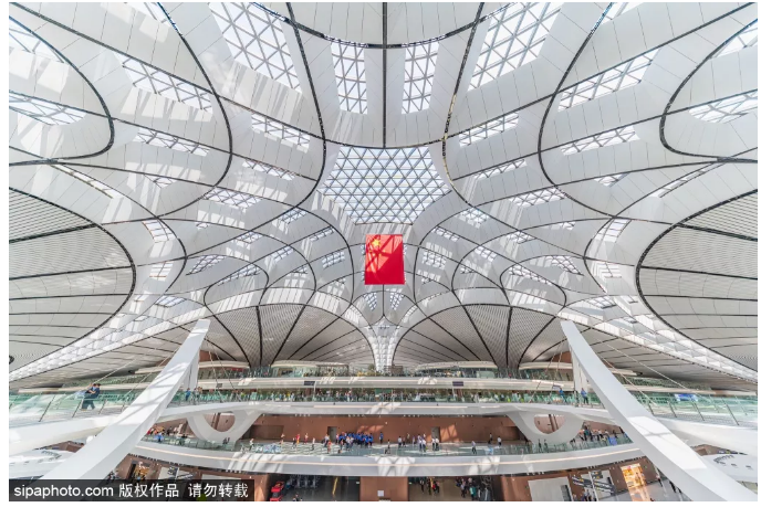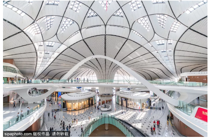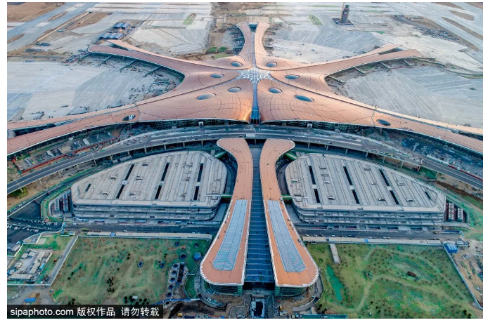 北京大兴机场航站楼占地140万平方米,是世界最大单体航站楼,相当于63个天安门广场的大小,仅屋顶投影面积相当于25个足球场~