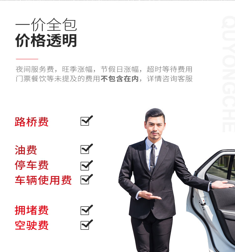 1.一价全包,包含高速费,停车费,用车费(一口价服务不接受中途经停、绕路、临时改变路线);
