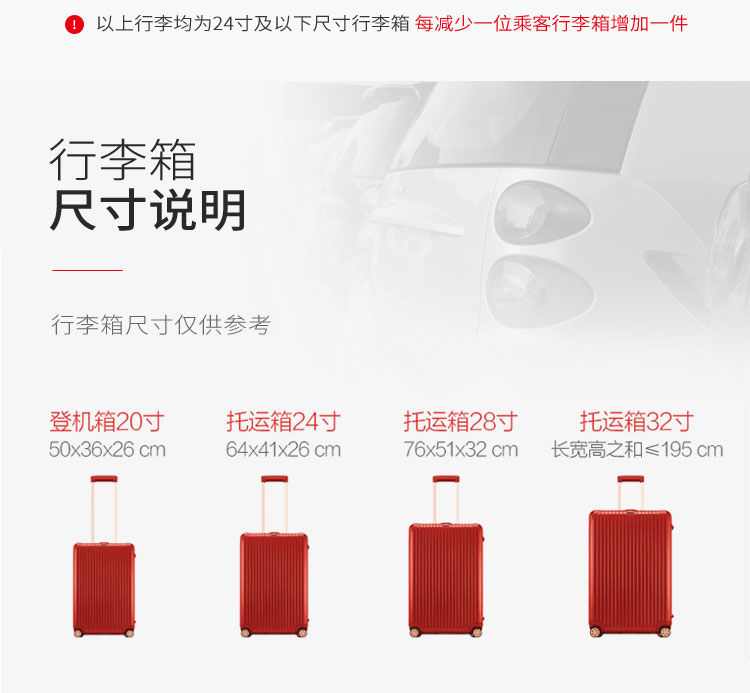 行李过多或者过大时,建议您预定更大车型,如果预定车型无法装载行李的情况,我司不承担责任。